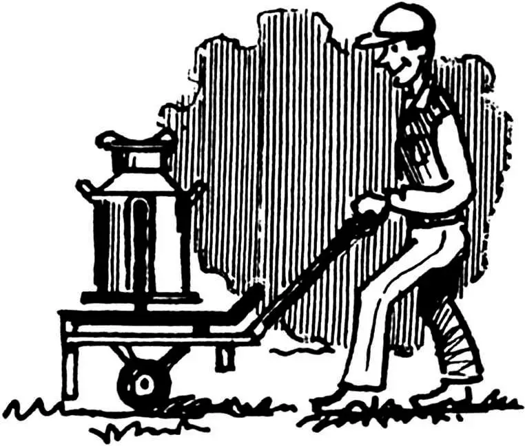 The design of a cart I made significantly facilitates these operations. Its folding frame consists of two parts—upper and lower. The bidon is in a suspended state and is moved from the cart to the ground and vice versa using a lever installed on the upper frame. To ensure stability at this moment, special supports are fixed on the lower frame. In winter, skis can be attached to these supports.