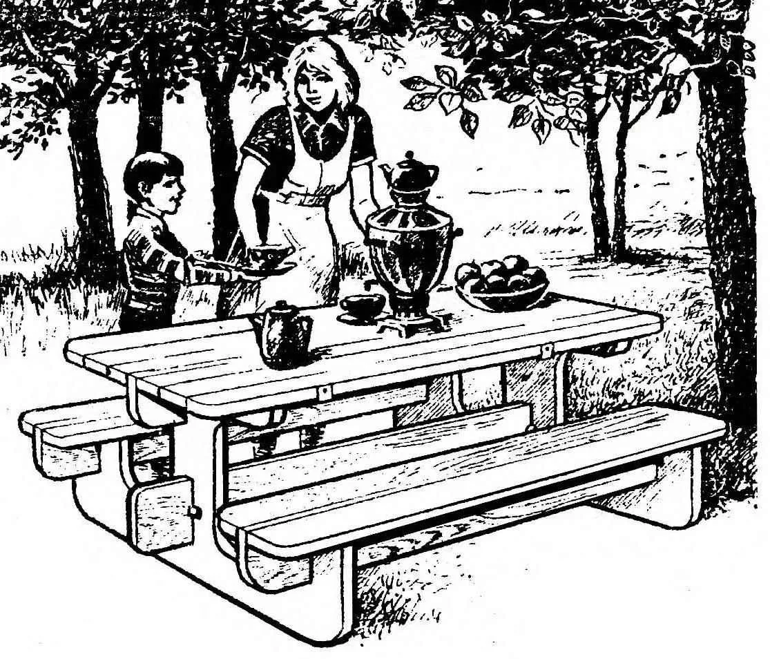 The combined table that you see in the picture, designed for garden or suburban area. It can be easily disassembled, so it is possible for winter to hide in the barn or under the canopy. It is assembled from two shaped racks connected in the middle and on the edges of the planks with screed laid on top of the countertop. Options stands form shown in the figure. The size depends on thickness of boards, ties.