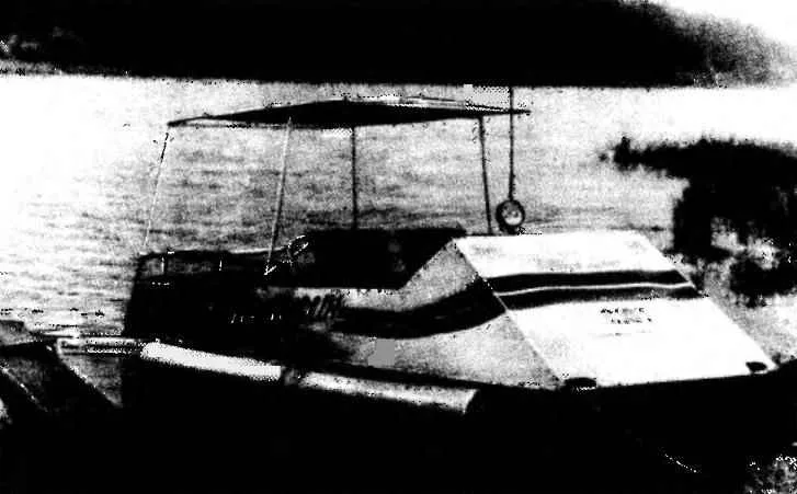 How “Dolphin”, with impressive dimensions and weight, from the municipal garage fell on the shore of the lake? Transported it on the roof of the car. This involved the manufacture of wooden slats and copper tubes with a diameter of 18 mm a special stand on the trunk, to buy four strong synthetic cord with hooks and two dural tube for mounting aquapod to the front and rear bumpers.