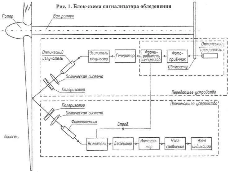 During configuration of the alarm device the ice can be simulated cellophane or plastic wrap, placing it on the surface of the test object. The final regulation of the signalling device are produced in real icing by orienting the transmitting and receiving device relative to the surface of the blades of the controlled object, and the polarizer receptor – relative to the polarizer transmission device so that in the absence of icing, the amplitude of the signal at the output of op-amp DА2 (Fig. 3) was minimal, if any — max. High achieve also a change in the focal length of the optical system of the receptor.