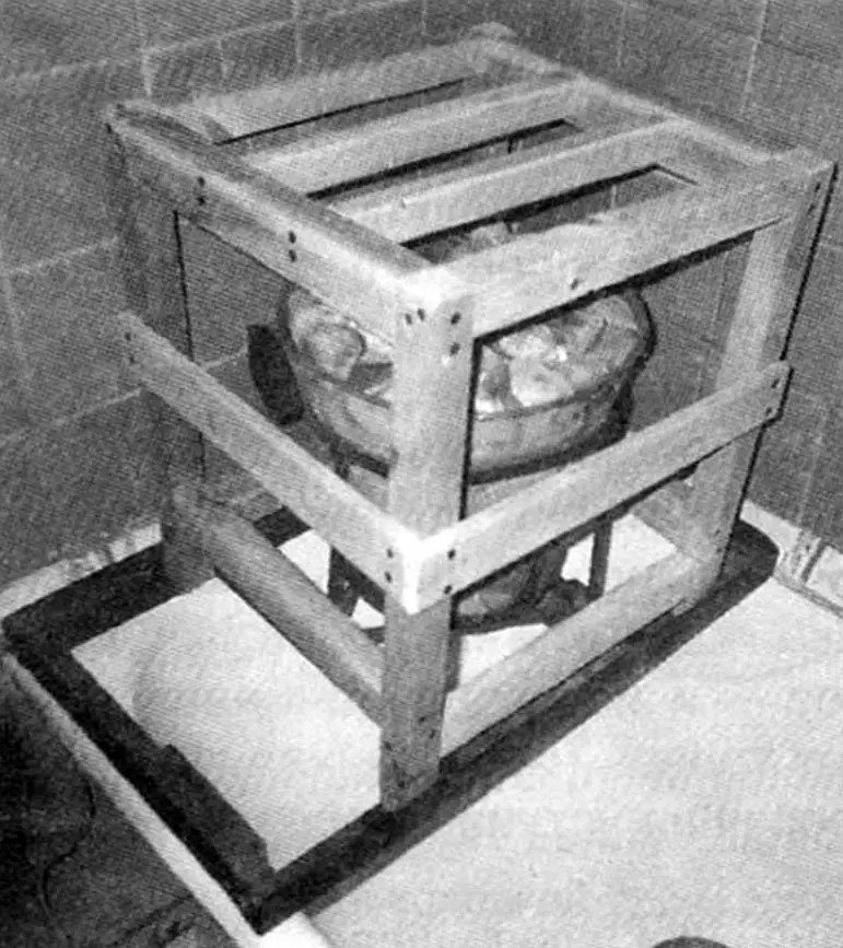 The “heater stove” itself has remained virtually unchanged – it is a 10-liter tin bucket (or laundry bin) filled with heat-accumulating material. As experience has shown, it is better to use ceramics from high-voltage insulators or porcelain sanitary ware instead of stones. When using ceramics, the “heater” operates more stably, while stones crack over time and require replacement.