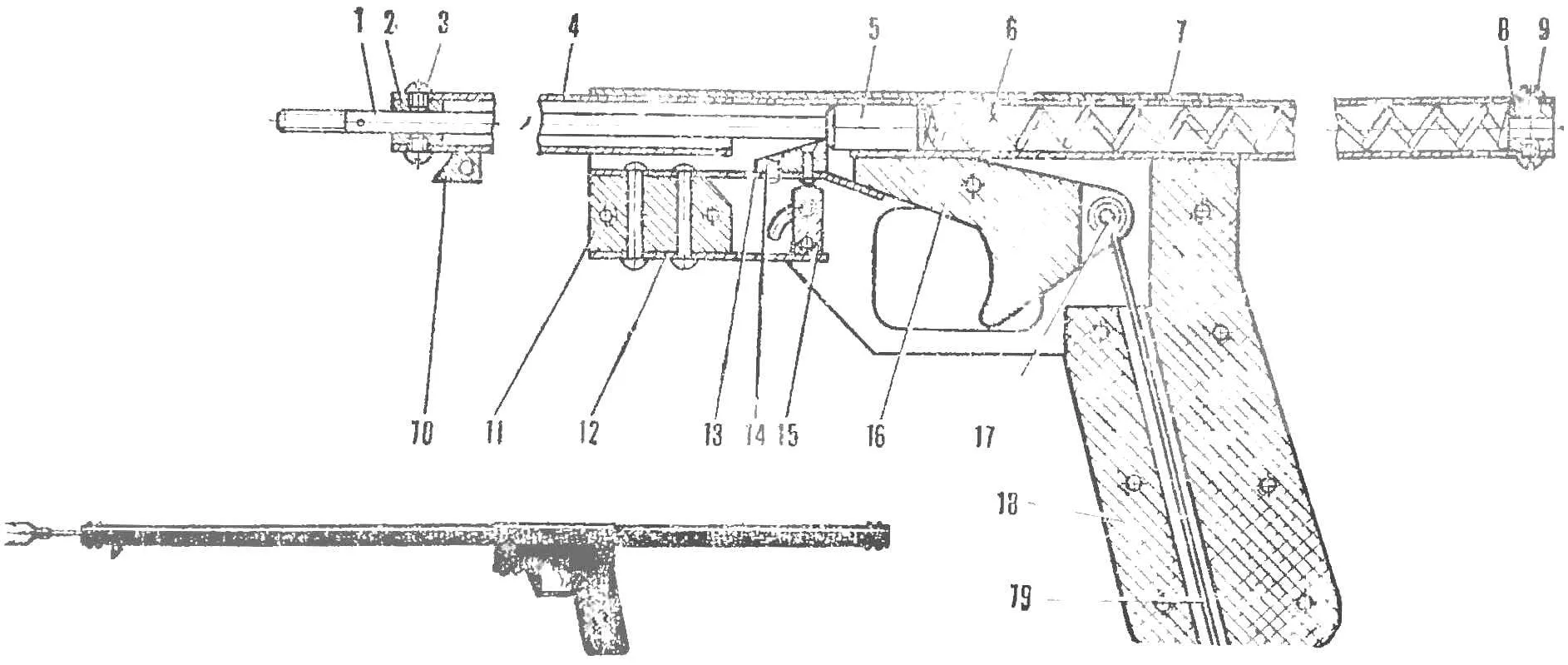 1 — harpoon, 2 — sleeve, 3 — M3 screw, 4 — barrel, 5 — piston 6 — spring, 7 — holder, 8 — Bush 9 — screw M3, 10 — hook 11 — insert, 12 — spring fuse, 13 — spring, sear and 14 sear, 15 — fuse 16 — trigger, 17 — axis thrust winding Lin, 18 pen, 19 — pull winding Lin