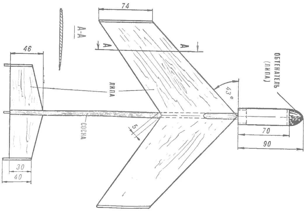 A wing of the phony veneer of variable thickness: in the centre is 4.1 mm at the ends — 2 mm. wing Profile is PLANO-convex. V-Angle = 14°. Between the two halves of the wing are glued together with butt Amalita and are attached to the upper surface of the fuselage. The greatest thickness of the airfoil reaches at a distance of 1/3 of the chord from the sock of the wing. Sweep — 94°.